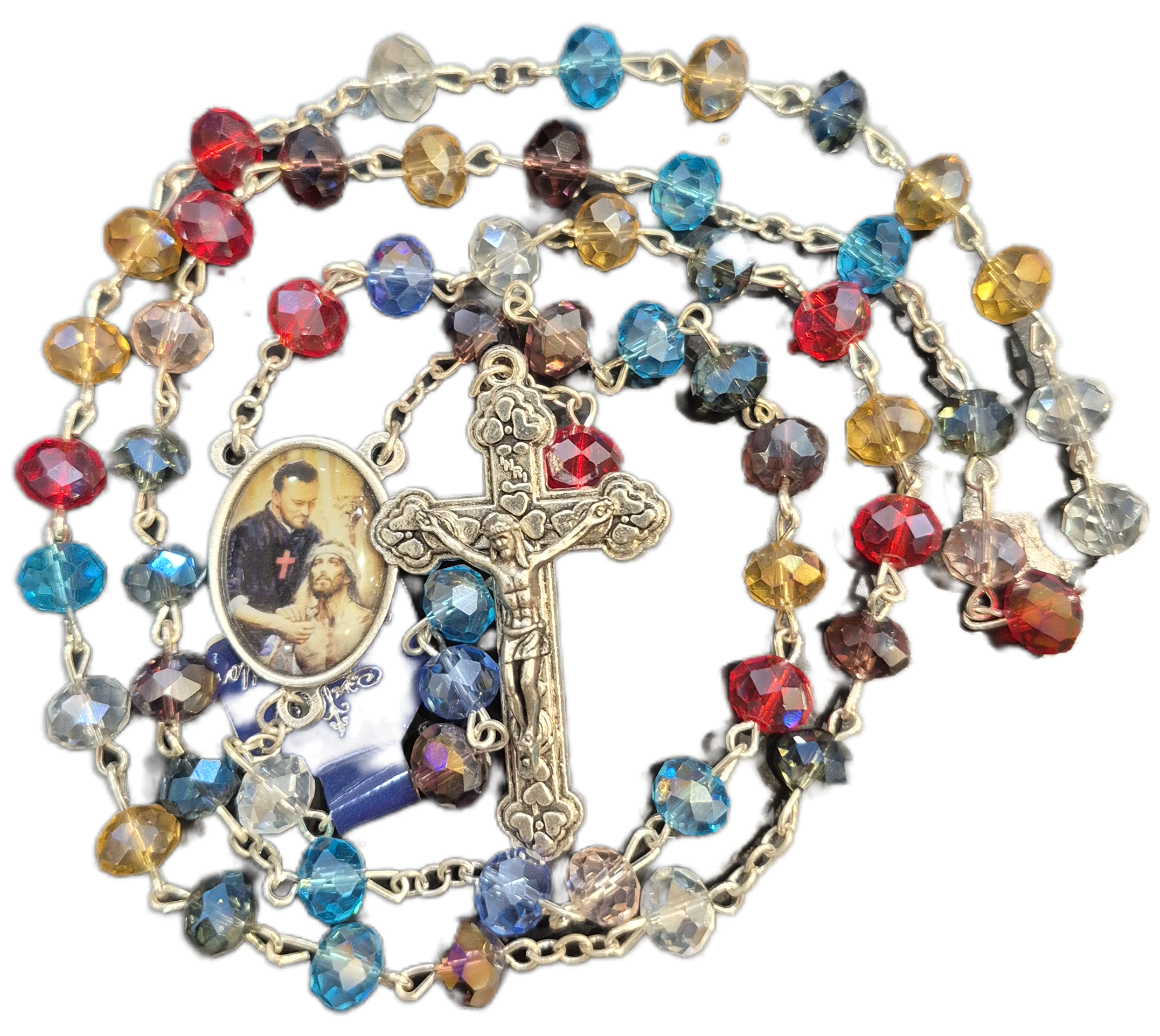 Crystal rosary with coloured crystals centre piece is compassion, crucifix is patterned silver coloured.