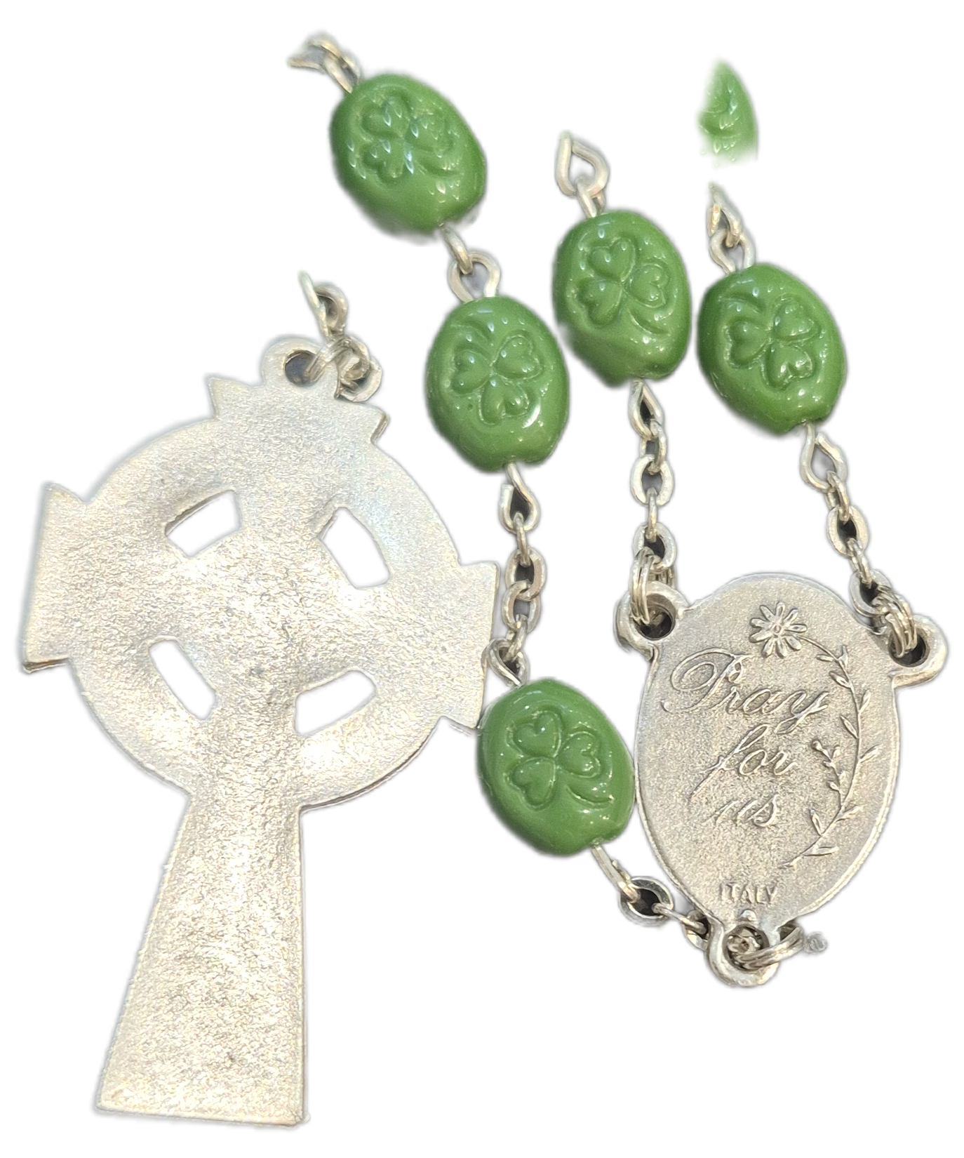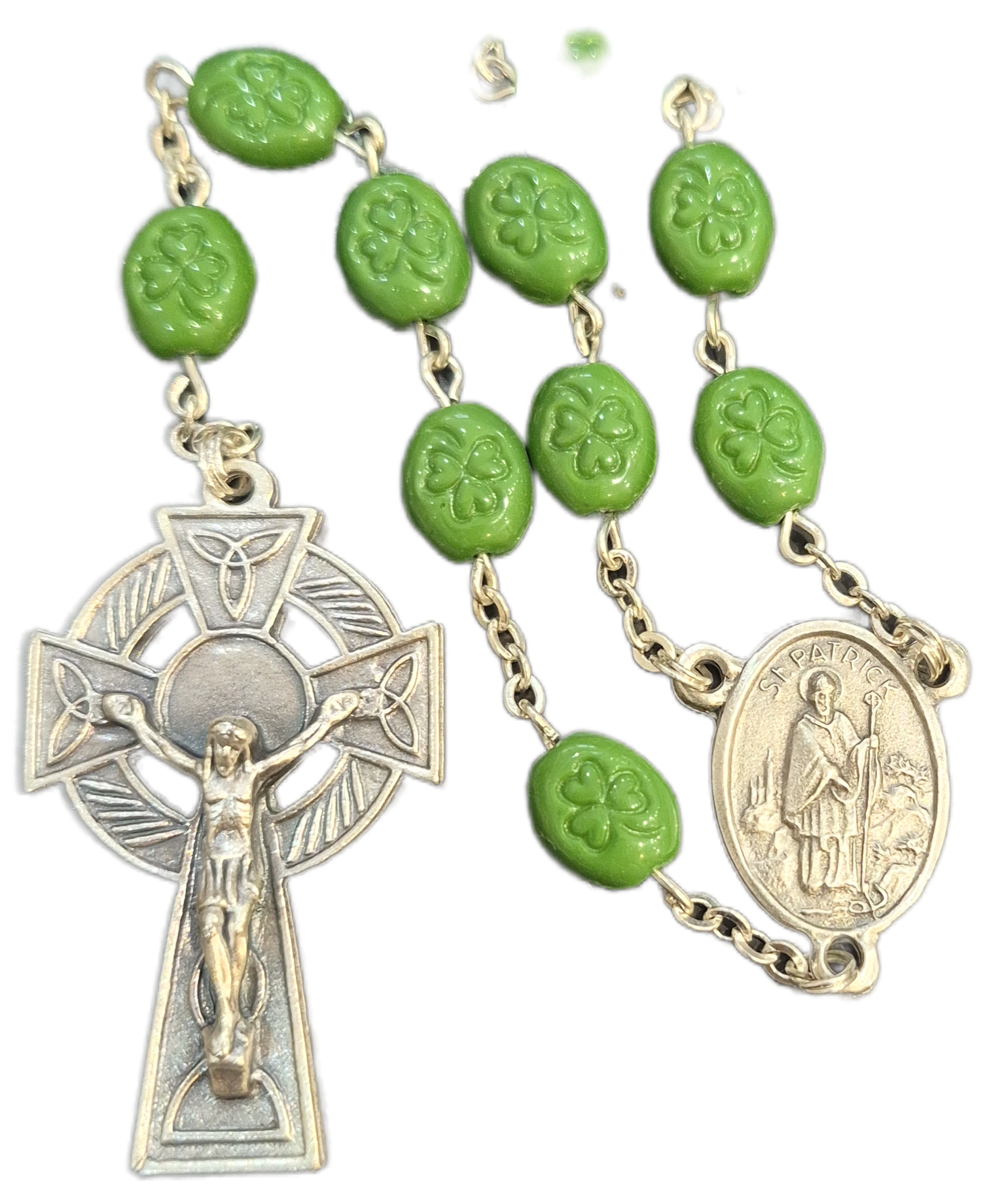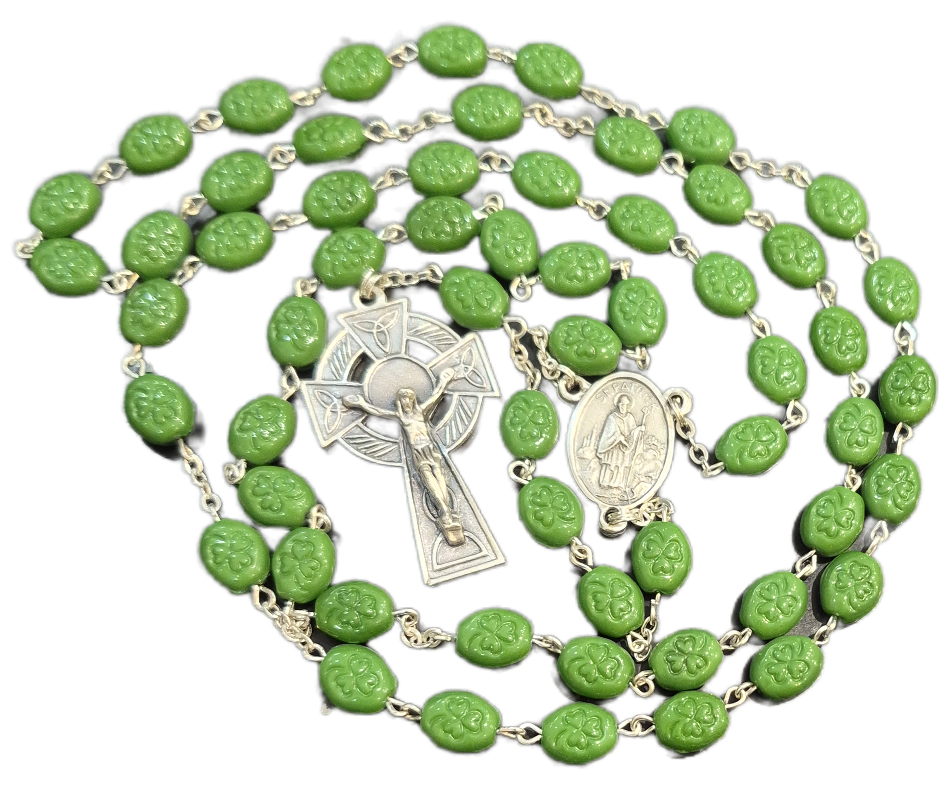 Green beads each one embossed with a shamrock.