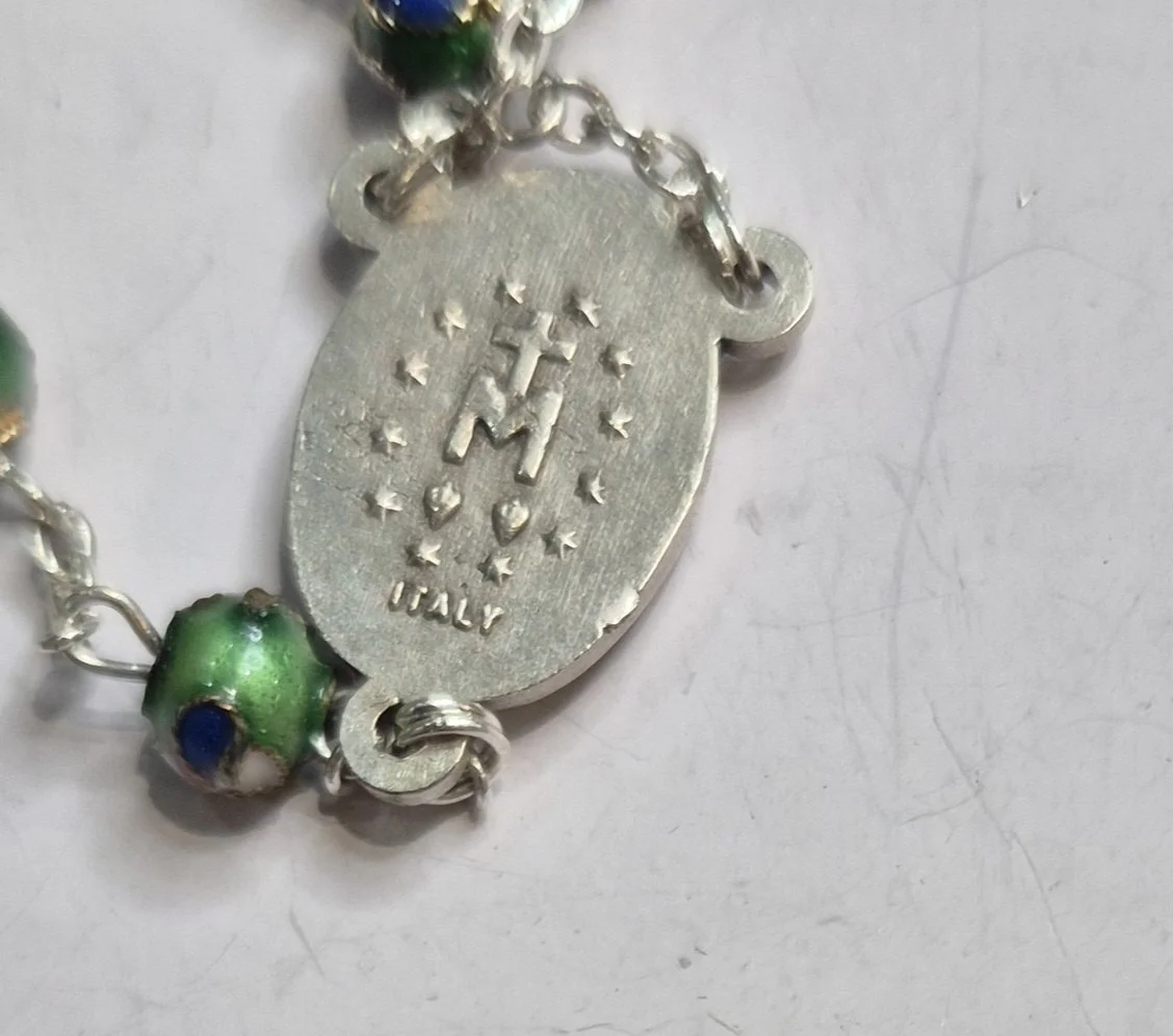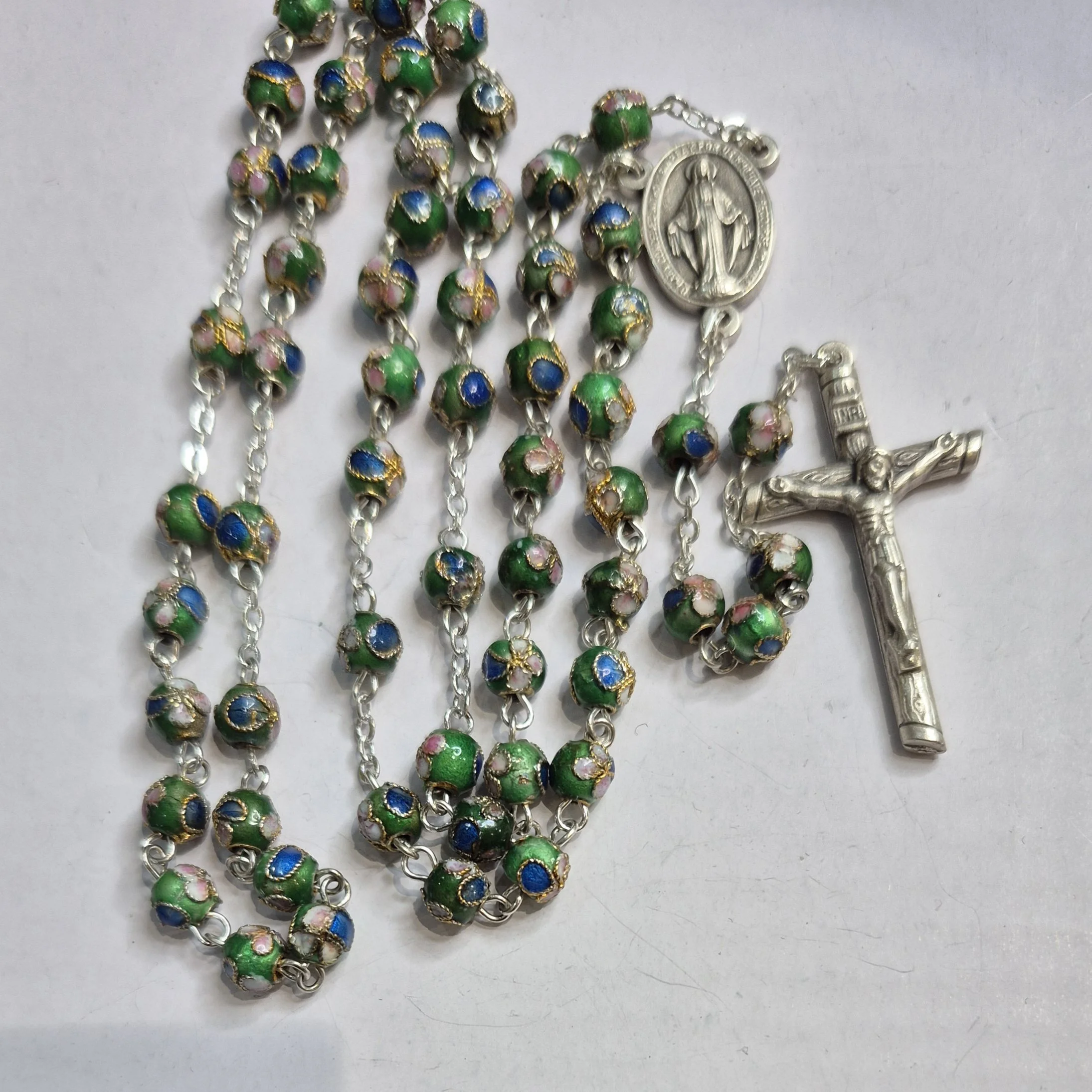 Pretty green Cloisonne rosary beads, centre piece our Lady with neat crucifix finish.